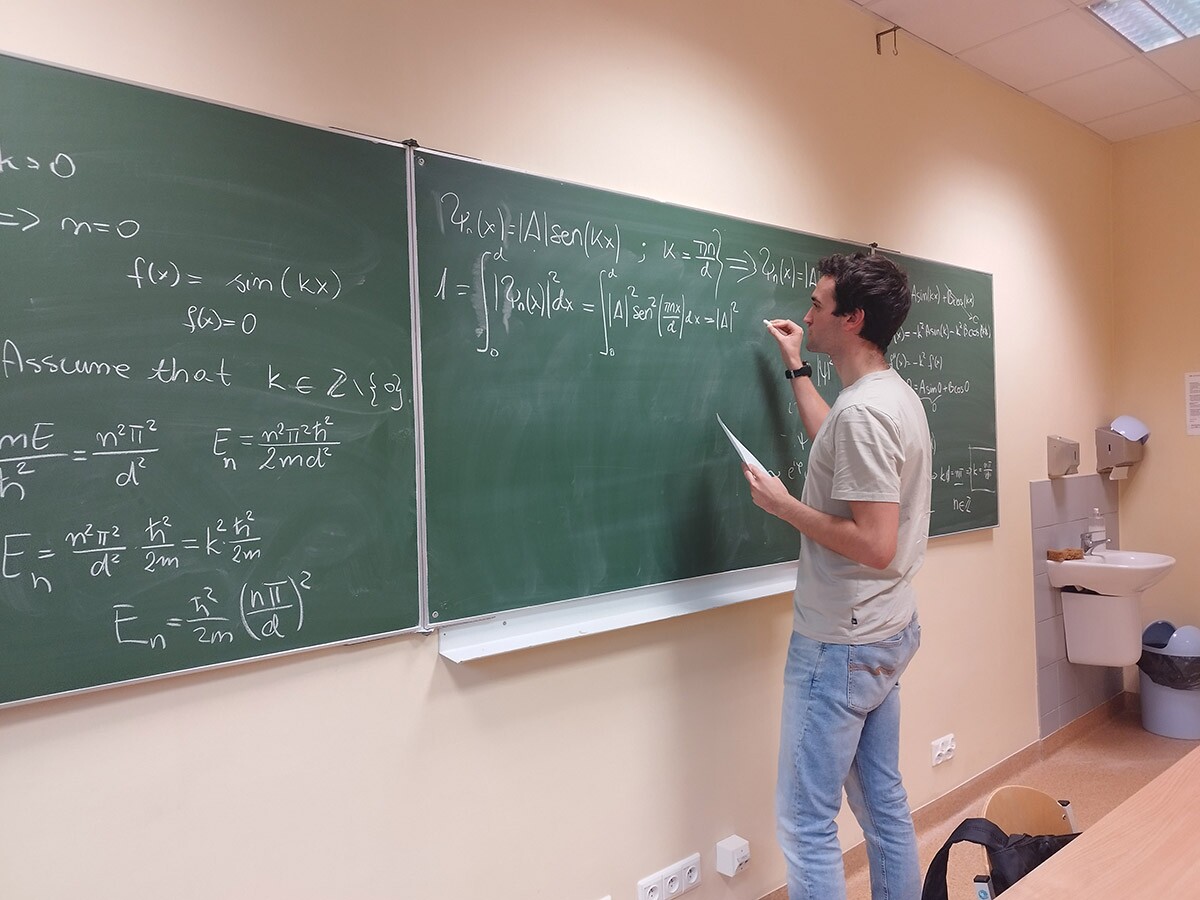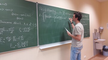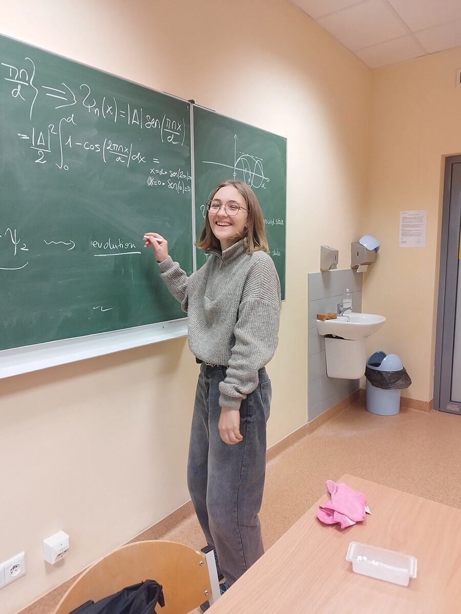 The scientific part of the meeting was devoted to analysing the model of a quantum particle in an infinite potential well. The students demonstrated that the energy spectrum is completely quantised and discussed the corresponding quantum states. The discussion was accompanied by an active exchange of ideas and strong engagement among the participants.