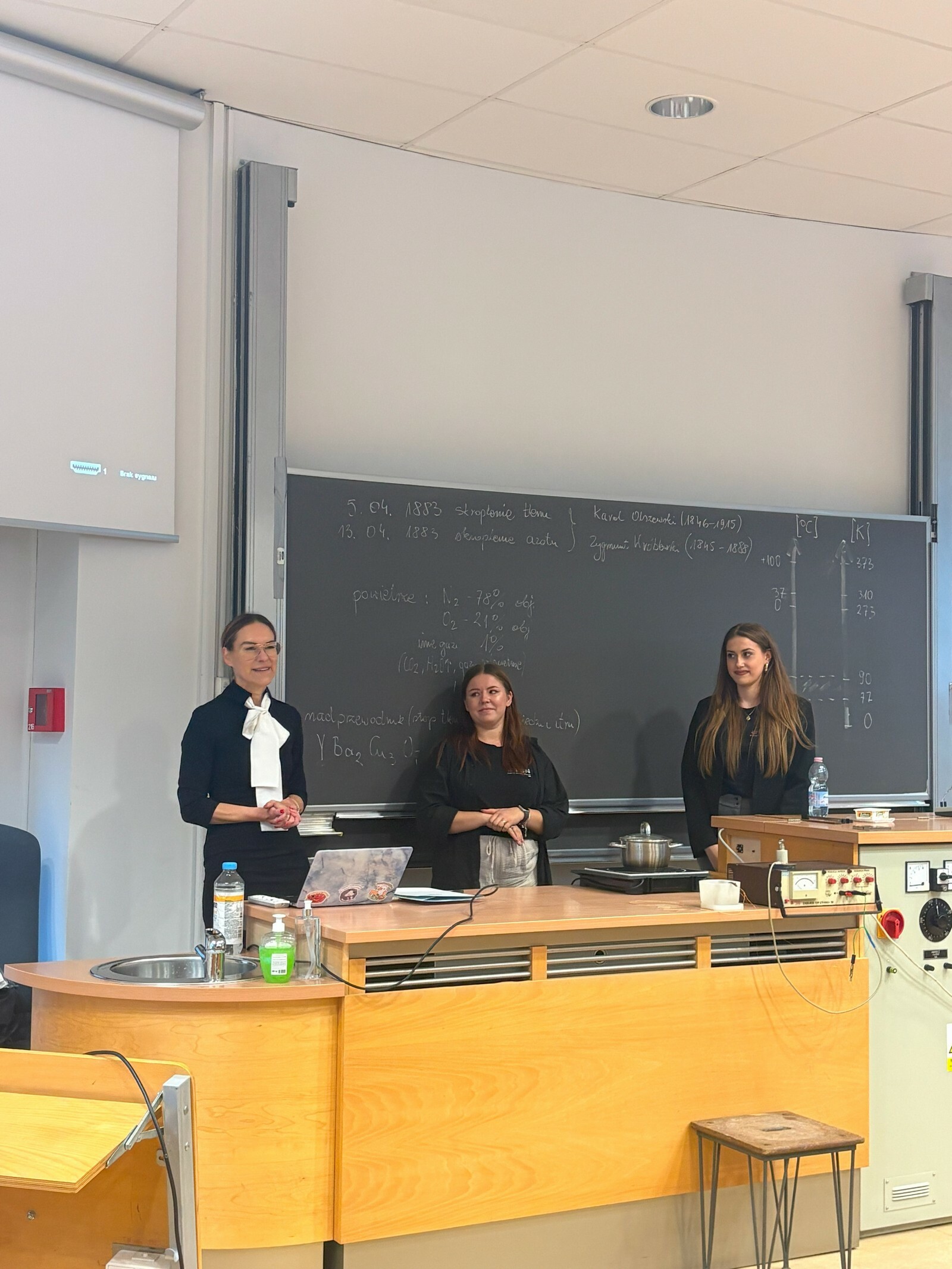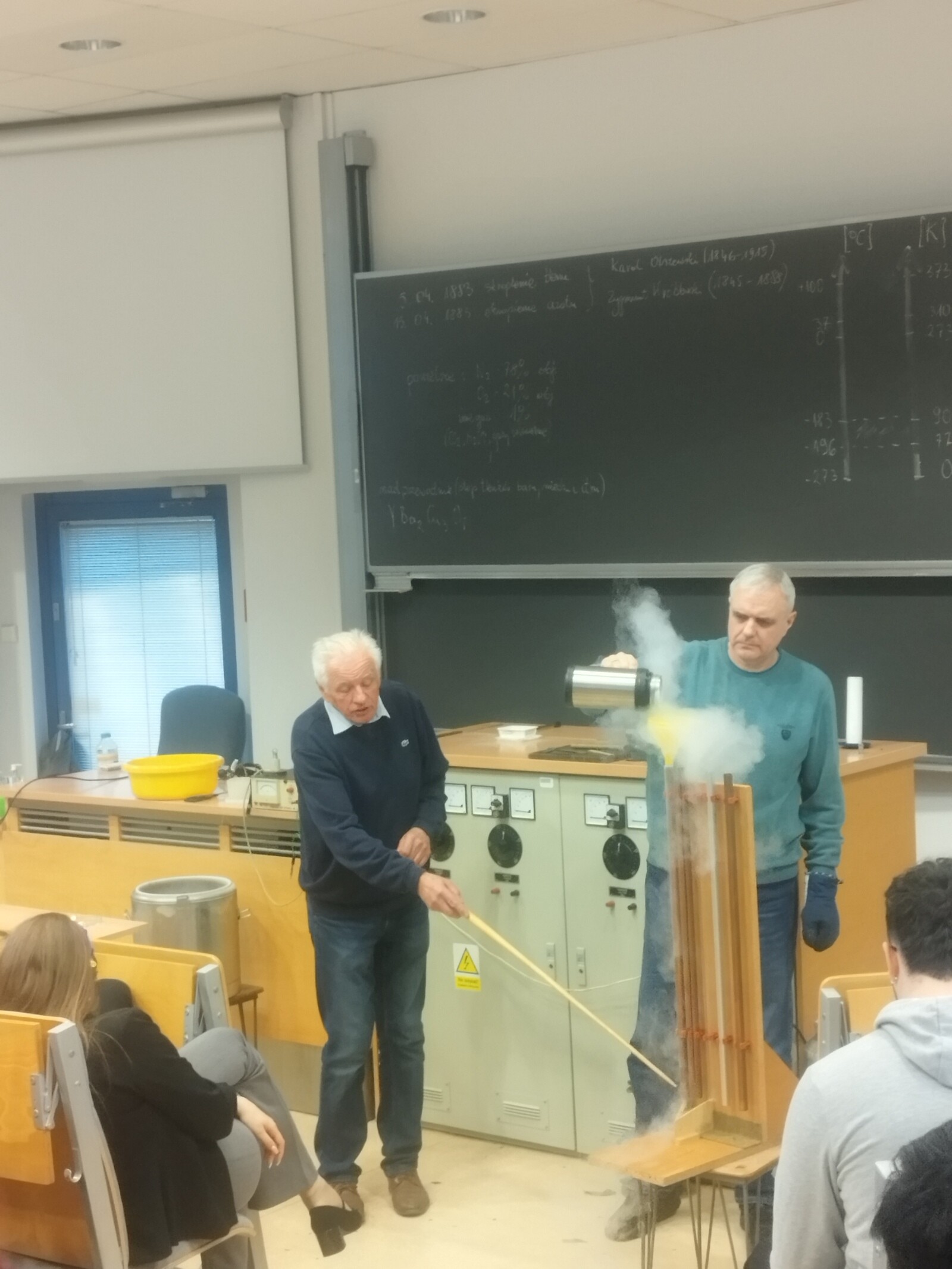 Afterwards, participants had the opportunity to watch a series of fascinating liquid nitrogen experiments, prepared by Dr. Stefan Jerzyniak and Mr. Sebastian Kruk. The presenters demonstrated, in an accessible and visually impressive way, how low temperatures affect the properties of materials.