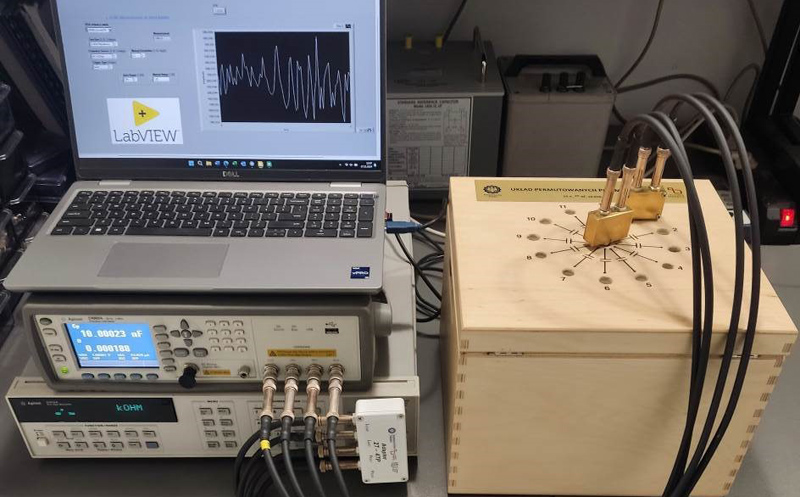 Stanowisko do badań współczynników temperaturowych i testowania oprogramowania LabVIEW sterującego przyrządami Agilent 3458A i Agilent E4890A (po prawej stronie fotografii widoczny zmodernizowany układ do badań nieliniowości samplerów)